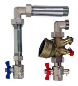 STOCKER PRO Wärmezählerset vertikal inkl. IMI TA Compact P Anschlussset für Fussbodenheizungsverteiler inkl. allen Absperrhahnen, Verschraubungen und Wärmezähler-Passstück für Wärmemengenzähler mit Einbaulänge 1“ 130 mm oder ¾“ 110 mm. Das im Set enthaltene Einregulierventil Typ IMI TA Compact P garantiert den automatischen hydraulischen Abgleich aller Fussbodenheizungsverteiler im Netz.