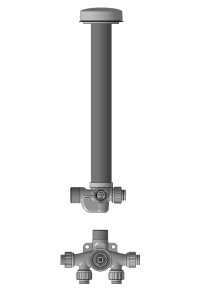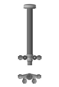 vierfach, Eingang von hinten mit Aussengewinde, Abgänge auf JRG Sanipex classic, PN 16, mit totraumfreiem Oberteil LegioStop®, Gehäuse aus Rotguss, geschliffene nichtsteigende Ventilstange und -sitz aus Edelstahl rostfrei, Dichtungen aus EPDM, Schutzrohr aus Kunststoff, Handrad/Rosette aus Kunststoff verchromt, für Wasser bis 90° C, für max. 16 BW mehr weniger